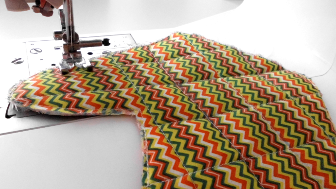 Luego, en las telas, marcamos unas líneas en diagonal y luego otras de forma cruzadas para hacer un acolchado. Y unimos las piezas de guata y tela de cada una de las piezas.