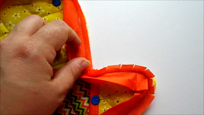 Una vez presentadas las piezas, las sujetamos con alfileres y vamos a empezar a poner el bies por todo el contorno, de esta manera: