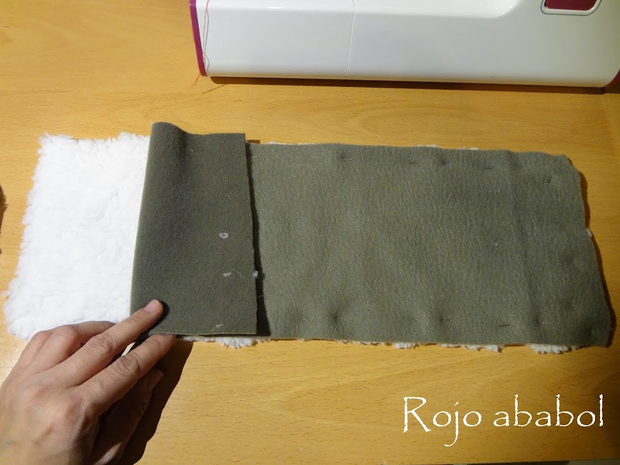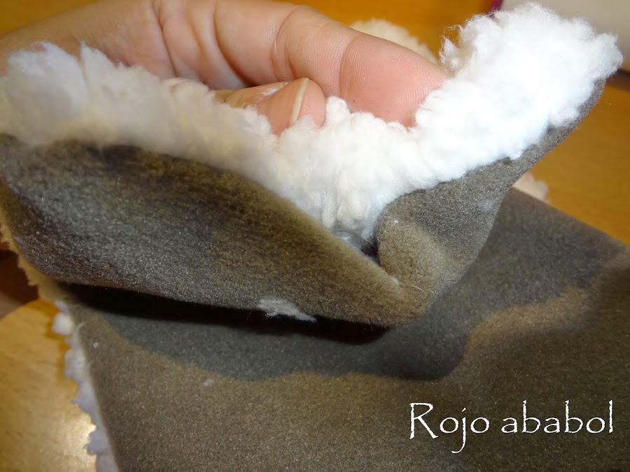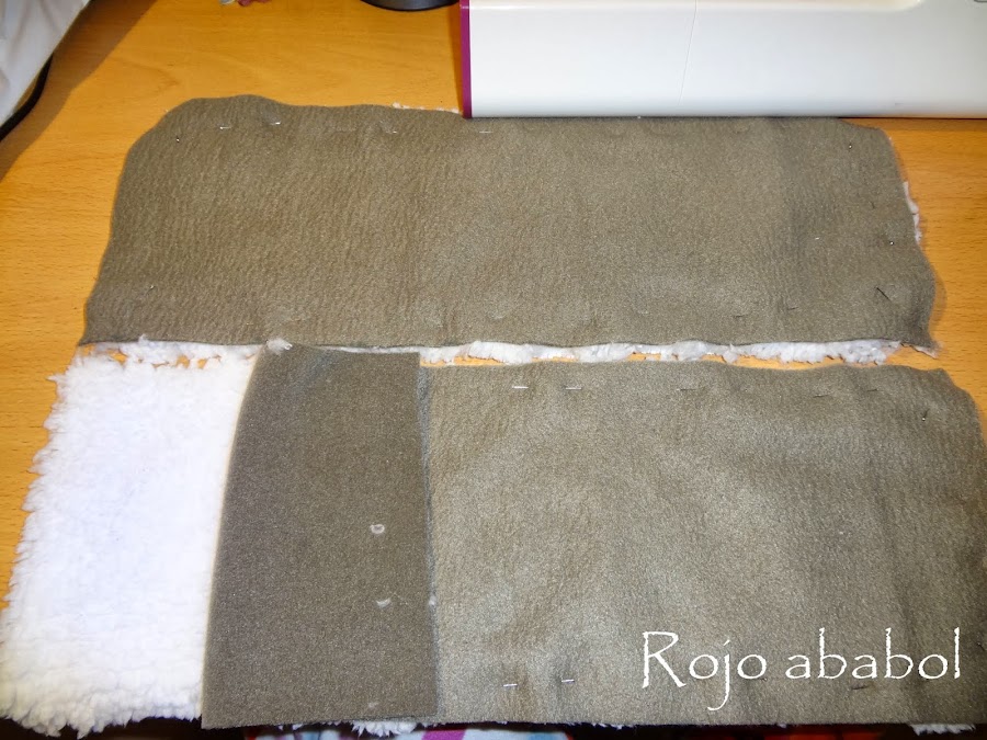 Cuatro rectángulos de tela, dos para la cara exterior y dos para la interior. Yo he usado polar de una bufanda para una cara y borreguito de minky de una manta para el otro. Las medidas dependerán un poco de la mano que vaya a usarlas, jeje. Mis rectángulos miden 16 de ancho, que para mi mano está bien porque es pequeñita, pero a mi marido por ejemplo no le caben... Así que la medida que os recomiendo son 20 cm de ancho por 45 cm de largo.