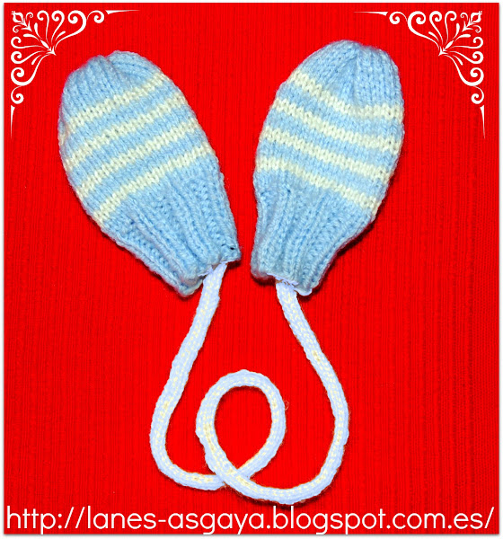 Y les tejí un cordón que se cose a las manoplas para no perderlas. Seguro que muchas ya conocéis este sistema, pero confieso que yo, que crié a mis hijos en Tenerife, jeje, nunca me hizo falta. Por si acaso, os lo cuento: se pone una manopla al bebé, se pasa el cordón por su espalda y luego se le pone la otra manopla. Encima ya le ponemos el abrigo, y así puedes quitarle el guante al bebé (o se lo puede quitar él) y no se pierde.