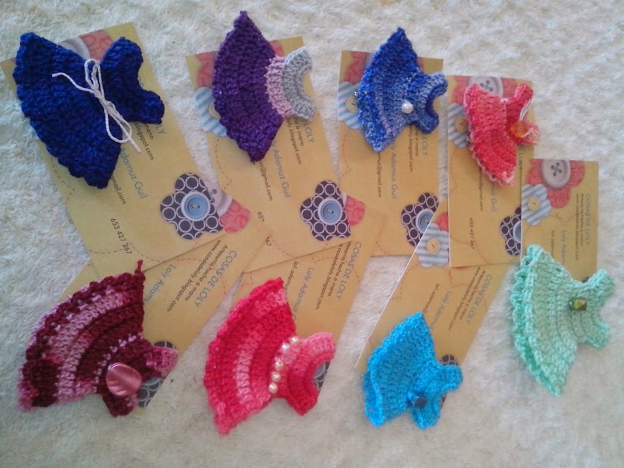 Unos cuanto broches minivestidos de distintos colores, distintos adornos y distintos tamaños, para que haya variedad y para todos los gustos.