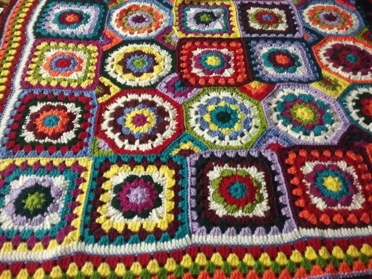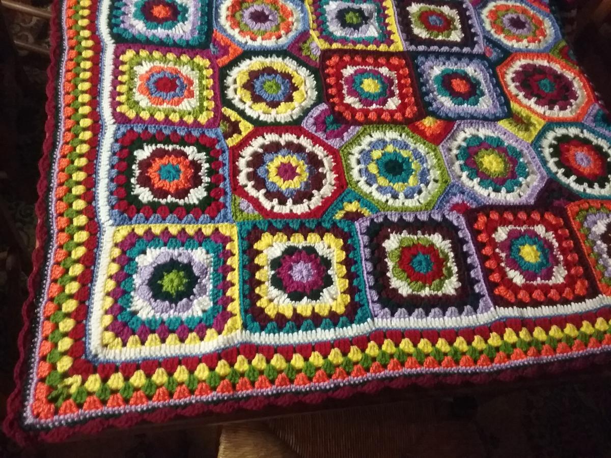 Bueno, pues aquí tenéis uno de los motivos por lo que he tardado en publicar: esta manta de granny square (creo que se llama así porque es el nombre que se le da a los cuadros que la forman); la vi en Pinterest y me puse manos a la obra. Si no recuerdo mal lleva 10 colores y a mi me ha salido con una medida de 1.30 x 1.10 ya que yo la he ampliado un poco pues la original me parecía demasiado pequeña.