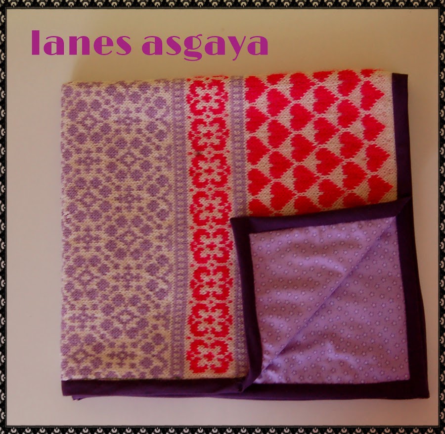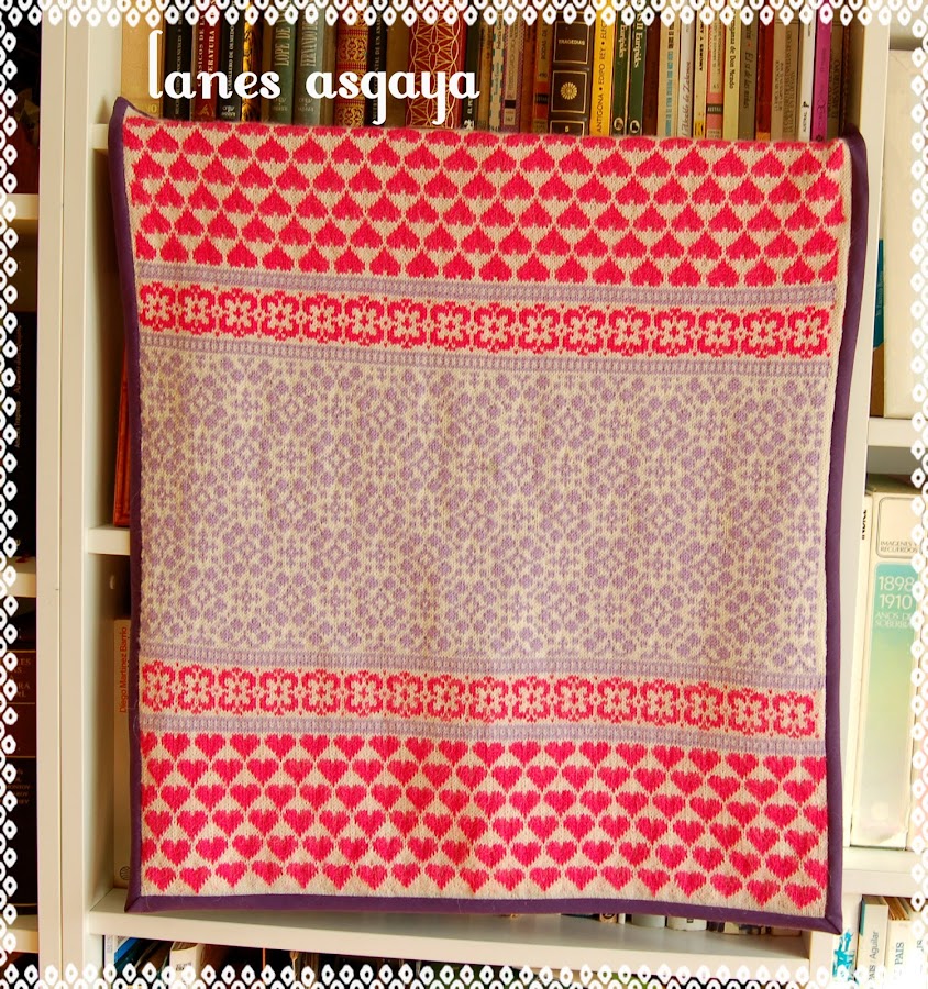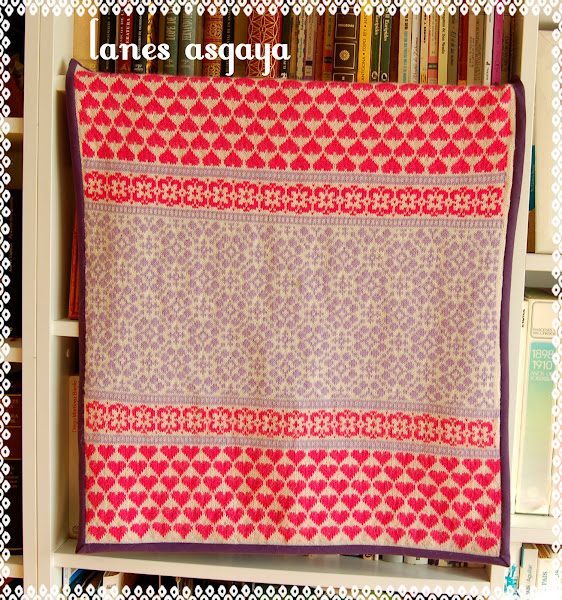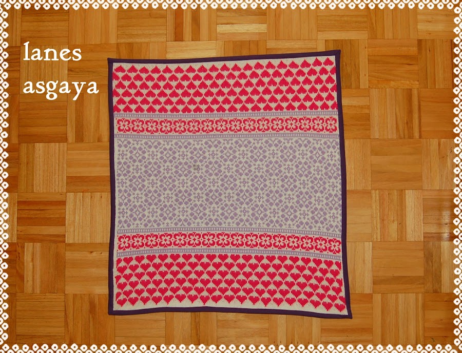 Después de terminado me di cuenta que en el dibujo central lila (que es precioso, por cierto) empecé con 3 puntos en blanco, pero no terminaba igual, pensando que después eso iría tapado con el bies. Pero no fue así y, si os fijáis, se nota... Aunque seguro que la mayoría de la gente en eso no se fijará
