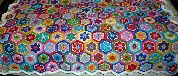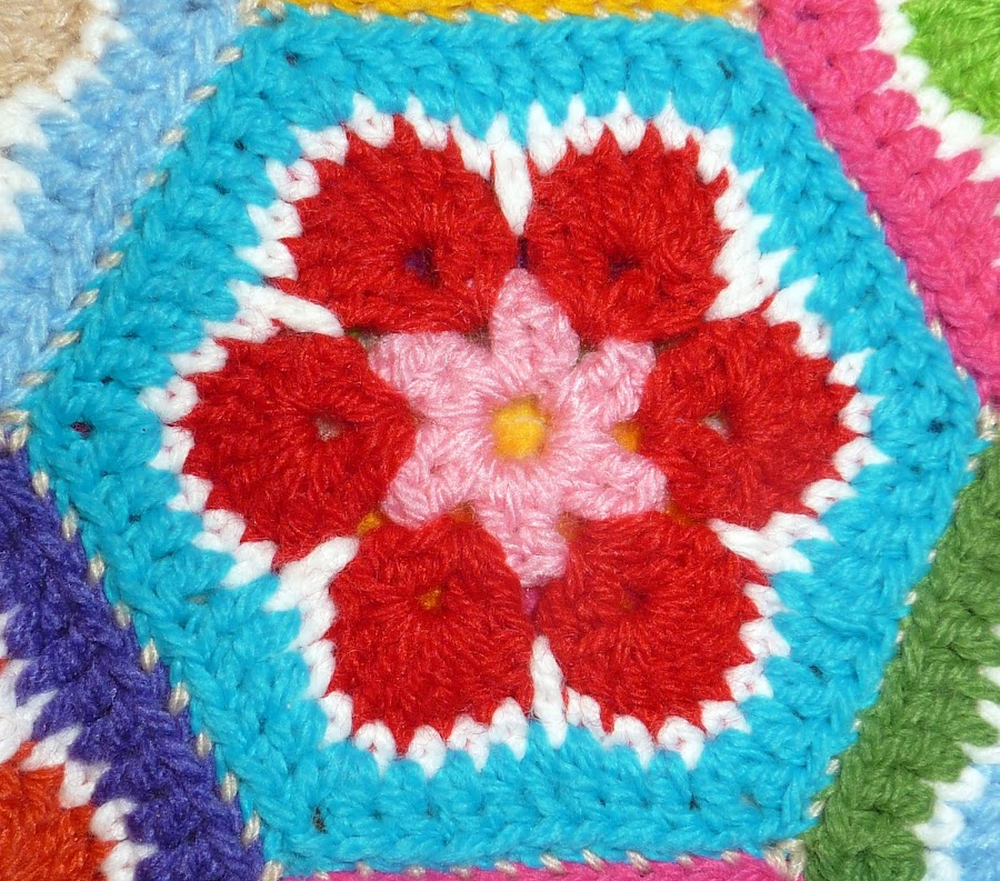 Como os muestro en las fotos, por cada bloque utilice tres colores diferentes: uno central, otro para los pétalos y el exterior. Pero en todos he usado el blanco para darle uniformidad al conjunto. Y también para hacer la vuelta final creando el borde de la manta.
