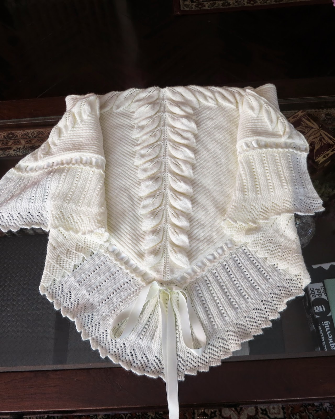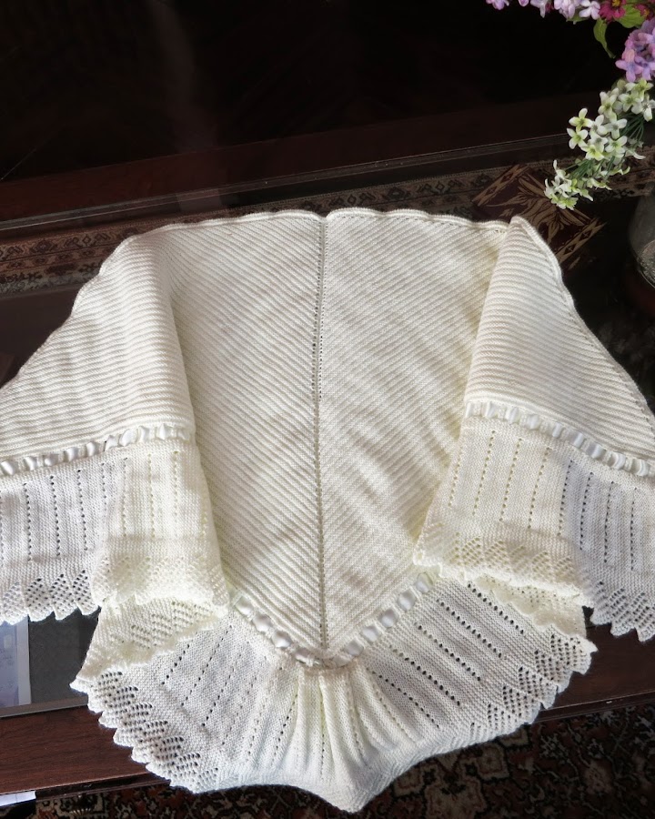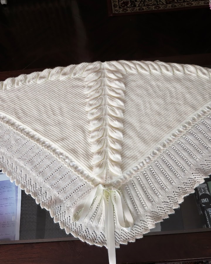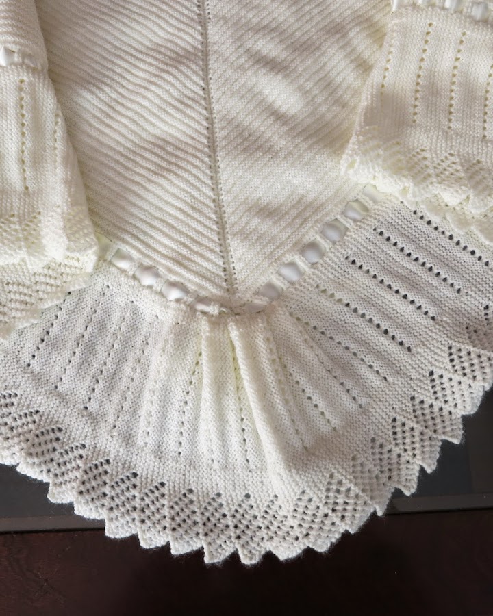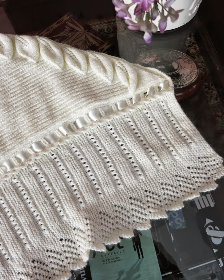 Lleva todo alrededor una ancha puntilla que se hace a parte y remata toda la manta.