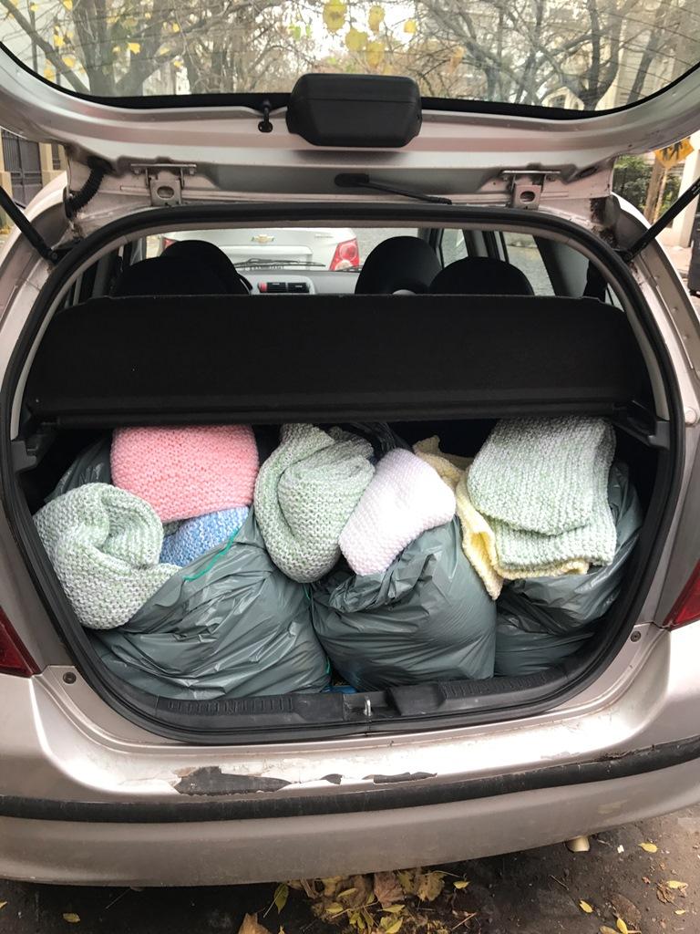 Acá el trabajo fue más complicado. Teníamos unas 27 mantas para mandar a Bariloche, pero ningún transporte voluntario. Y cuando intenté medir el volumen, me di cuenta que se necesitaban dos bolsos grandes para que entraran todas las mantas.