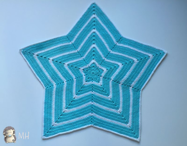 La última vuelta está hecha con pb (no he querido meter ningún borde o cenefa para no quitar forma a la estrella, ya que queda realmente perfecta). Simplemente hacemos 1 pb en cada punto alrededor de toda la mantita, salvo en los cinco vértices, en los que haremos (2 pb, 2 cad, 2 pb).
