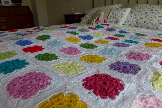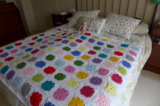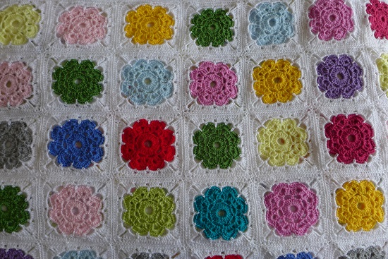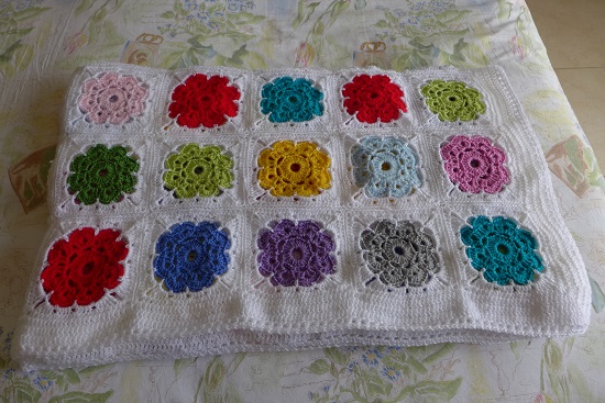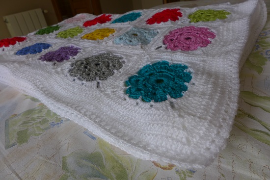 Y aquí os presento a mi manta terminada, una vez hechos los cuadrados en blanco, cosidos y tejido el borde. ¿Qué os parece?