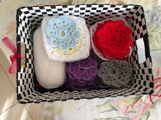 Después de elegir unos colores bien alegres comencé a tejerlas una tras otra sin pensar, un color tras otro, en total 10 flores de 13 colores diferentes, o lo que es lo mismo 130 flores. Las medidas aproximadas de la manta son 140 cm de ancho y 180 cm de largo, incluyendo unos 10 cm del borde. Las flores tejidas las iba guardando en la cestita