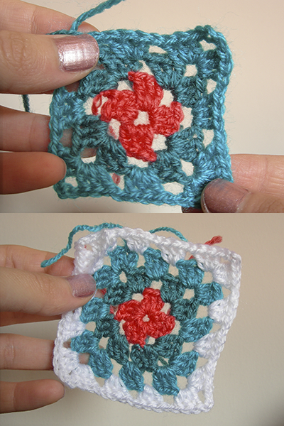 A continuación, tejemos las dos vueltas que quedan, siguiendo el mismo esquema: bloques dobles en las esquinas + tres cadenas, bloques simples en los lados + 1 cadena.