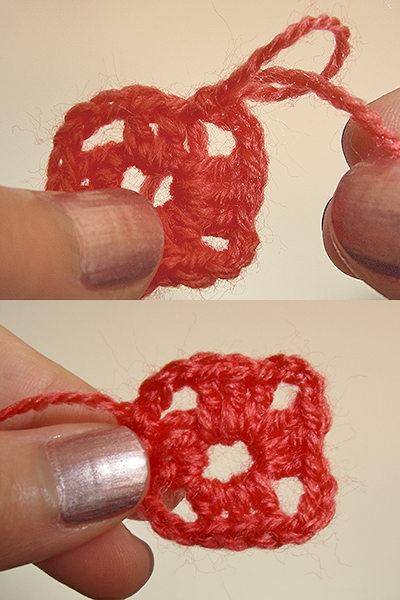 Una vez que hemos hecho los dos puntos altos, habremos completado el primer bloque de los cuatro que forman la primera vuelta. Para hacer los otros bloques, tejeremos tres cadenas para formar una esquina y tres puntos altos a través del centro del aro, terminando con tres cadenas. Es decir, tendremos que tejer:
