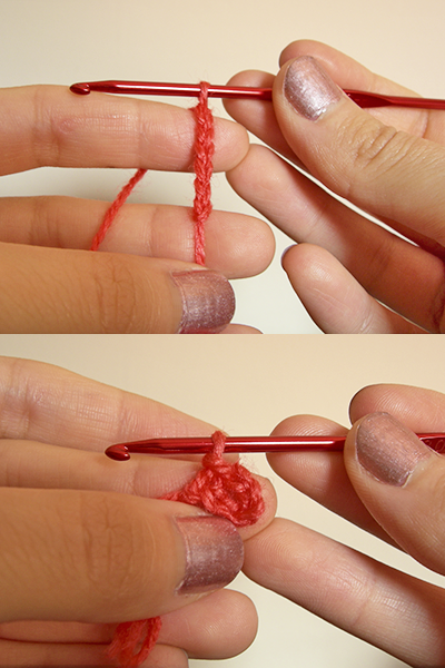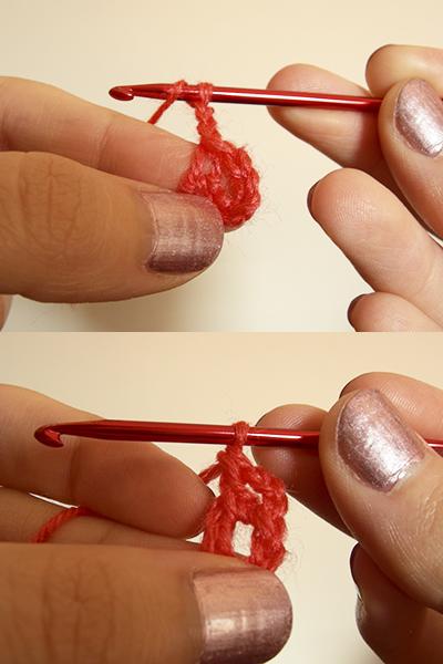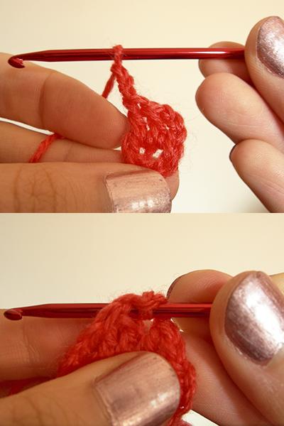 Una vez que tenemos las tres cadenas, tenemos que tejer dos puntos altos más. Pero ojo, porque en lugar de introducir la aguja dentro de un punto de la cadena, tenemos que pasarla por el centro del aro, es decir, rodeando la cadeneta en lugar de a través de los puntos ya tejidos.
