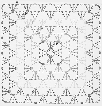 Por lo tanto, en esta vuelta tendremos que hacer cuatro bloques de esquina (cada uno compuesto por dos bloques de tres puntos altos y tres cadenas), y entre estos cuatro bloques, un punto de cadena.