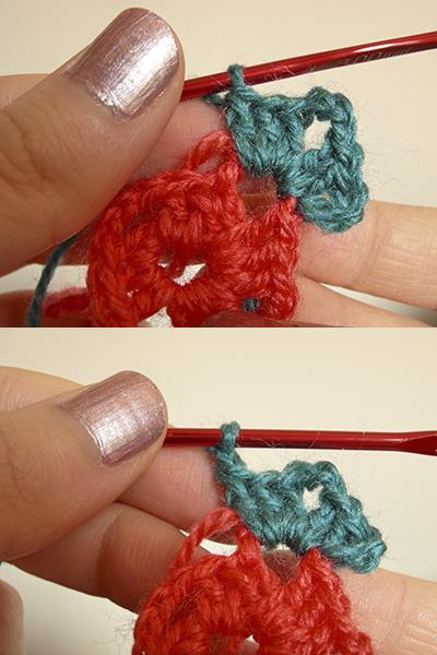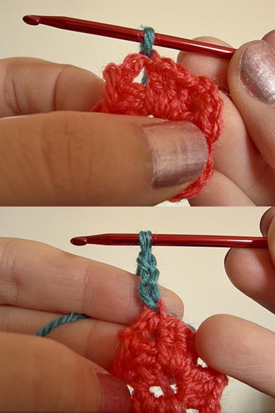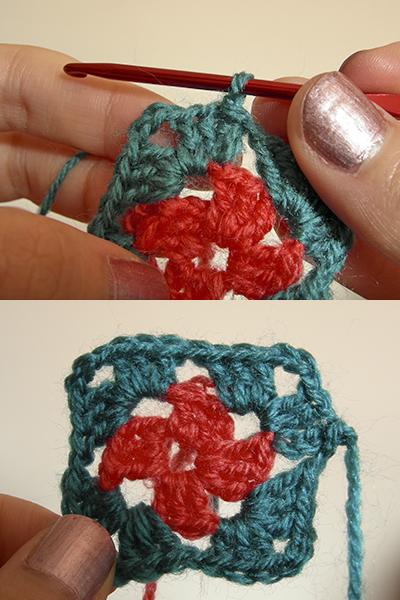 Continuamos con la segunda vuelta, de color verde azulado oscuro. Tendremos que repetir exactamente la misma operación que en la primera vuelta. Comenzaremos introduciendo la aguja en la primera cadena de cualquier esquina, sacaremos hebra para tener una lazada en la aguja, y tejeremos tres cadenas.