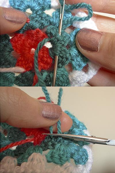 Por último, tendremos que "pulir" la labor escondiendo todos los cabos que han quedado sueltos. Para ello, utilizaremos una aguja colchonera, e iremos metiendo uno a uno los cabos por el revés del cuadrado, aprovechando las zonas más espesas.