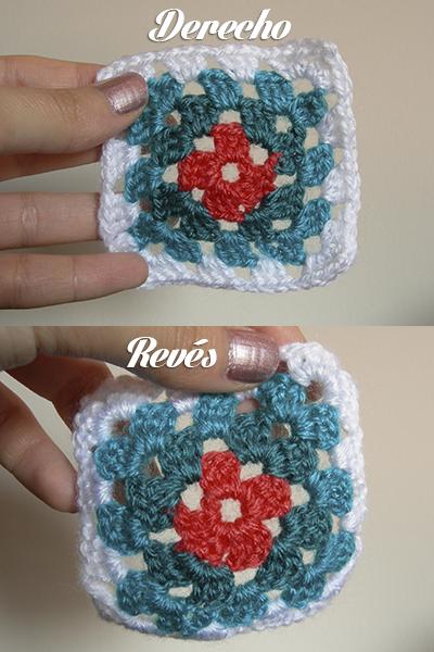 ¡Y ya está! Ya hemos hecho nuestro "granny square". Ahora sólo queda repetirlo tantas veces como sea necesario hasta conseguir el tamaño de manta que queramos. Os muestro el derecho y el revés de la labor, ¡tened cuidado y no os confundáis cuando cambiéis de color!