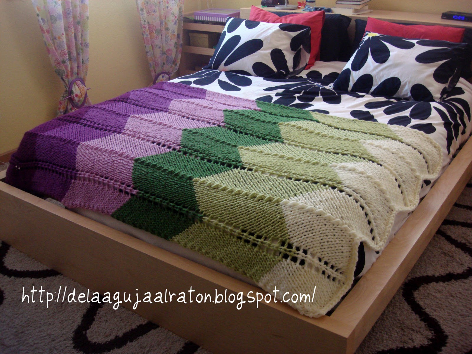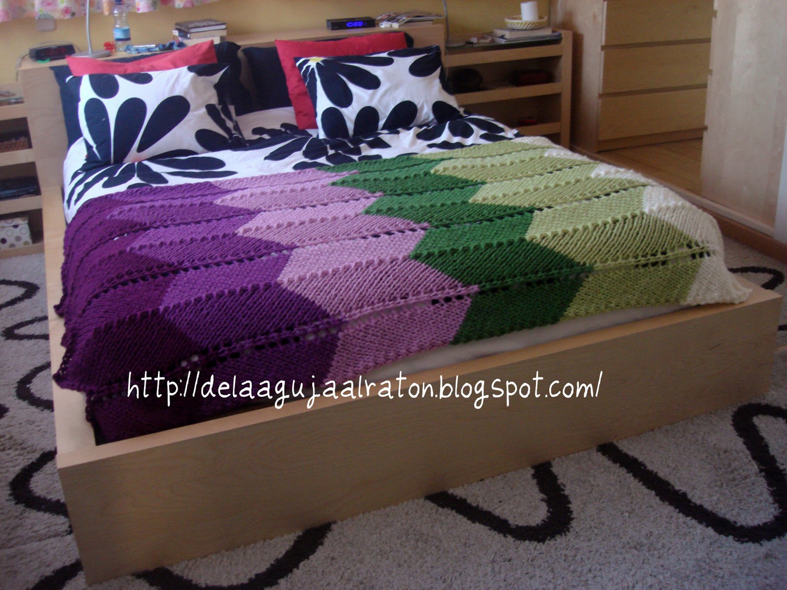 He utilizado 12 ovillos, 2 por cada color que tiene la manta, las medidas finales de la manta son 105cm de ancho por 180cm de largo.