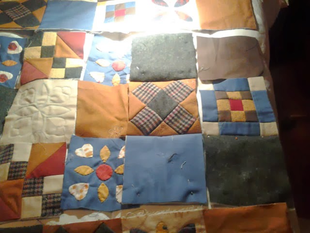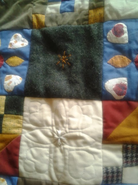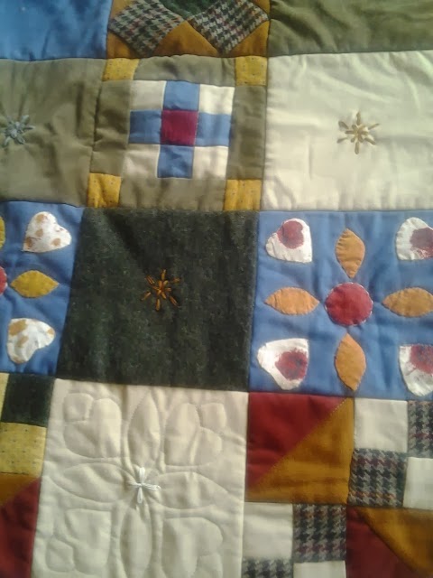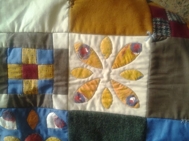 Esta formada por cuadrados de 22cm., algunos en tela lisa, otros con bloques de piezas y otros con aplicaciones.