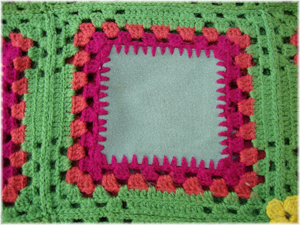 Va combinando recortes cuadrados de tela suave (tela polar de forros que se van quedando pequeños, animada también con el reciclaje) de varios colores, agujereados todo alrededor y rematados con ganchillo.