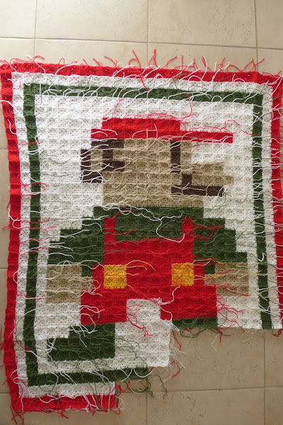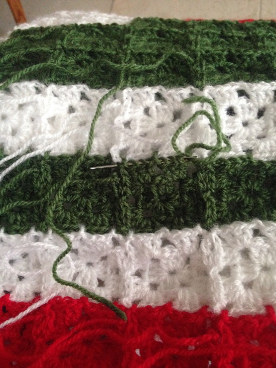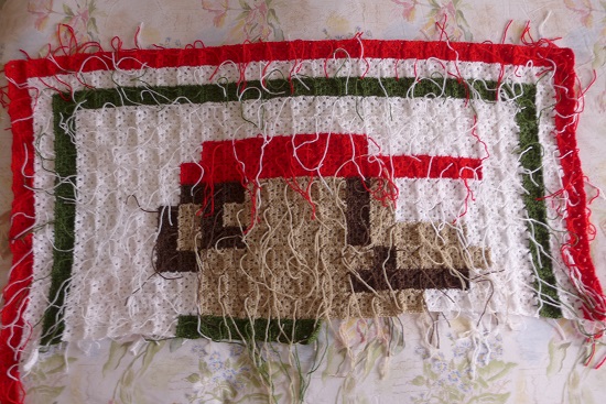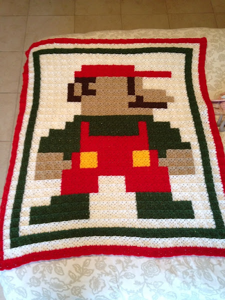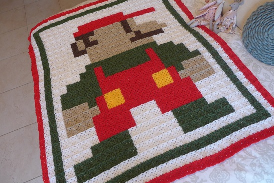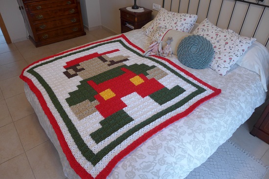 Como podéis ver la técnica ha sido la de tejer pequeños cuadrados o grannys, como se indica en este tutorial, que he ido uniendo sobre la marcha, siguiendo el patrón que encontré en Sweet Kiwi Crochet. Hay muchos modelos, incluso creo que hay aplicaciones que pixelan las imágenes con los que podéis hacer vuestros propios diseños.