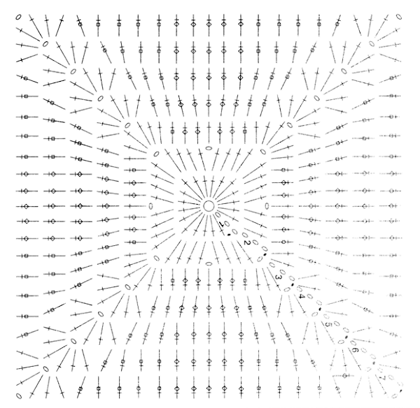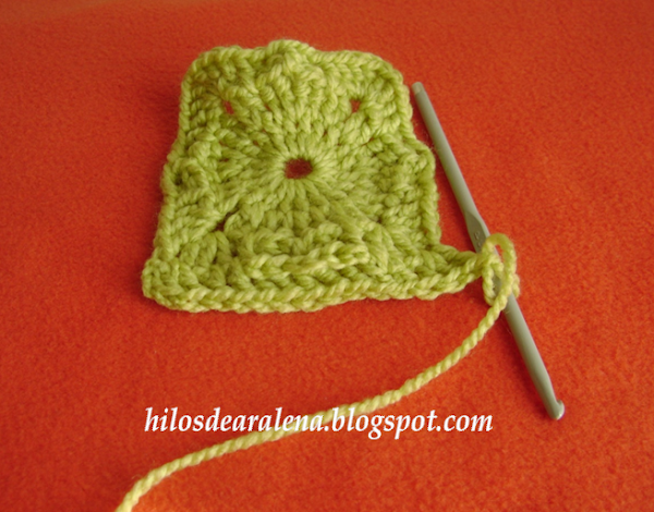 Comenzamos cada cuadrado haciendo una anilla con dos vueltas de lana alrededor del dedo. En ella se hacen 3 cadenetas y las 19 varetas de la primera vuelta