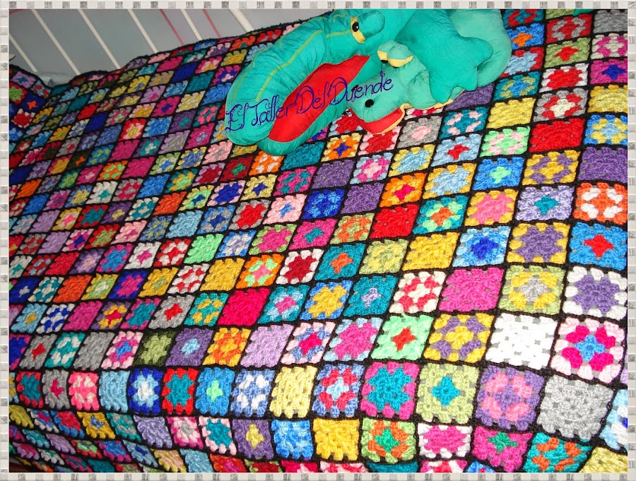 Multicolor y calentita. Estas son labores para hacer de a poco, en los ratitos libres, cuadradito a cuadradito y cuando menos lo esperamos.....tenemos un montón de ellos realizados. Esta labor la encontré en la revista Labores del Hogar N° 474 de Febrero 1998. En ella se muestra una manta en un solo color , se ve muy linda pero yo preferí colores vivos porque a mi nieto le llaman mas la ate ...