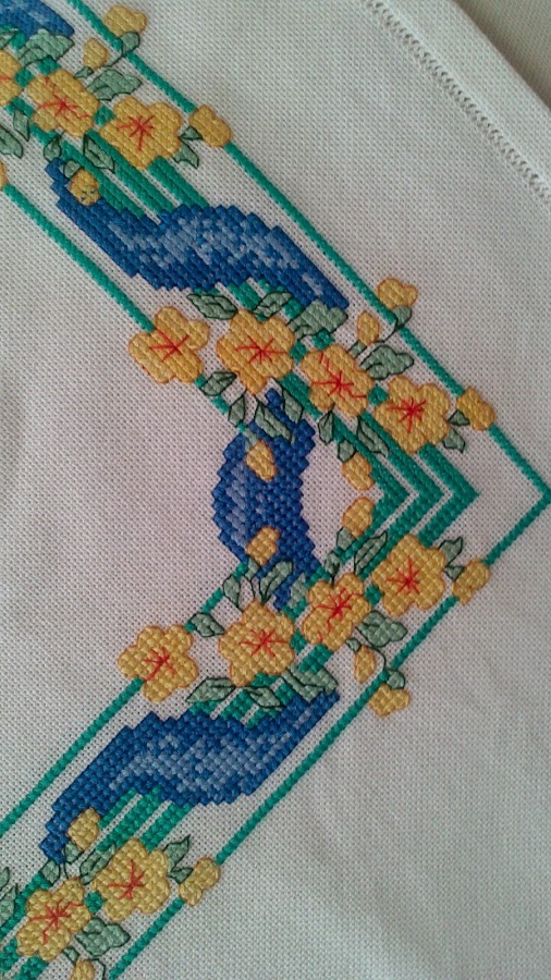 Volvemos con un mantel a punto de cruz, un mantel para una mesa pequeña de café. Lleva una cenefa simulando un lazo decorado con una pequeñas flores que se llaman prímulas, las esquinas y los centros le dan un bonito decorado.