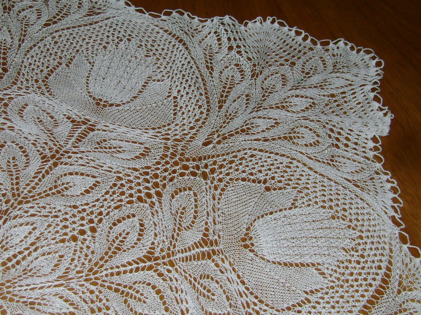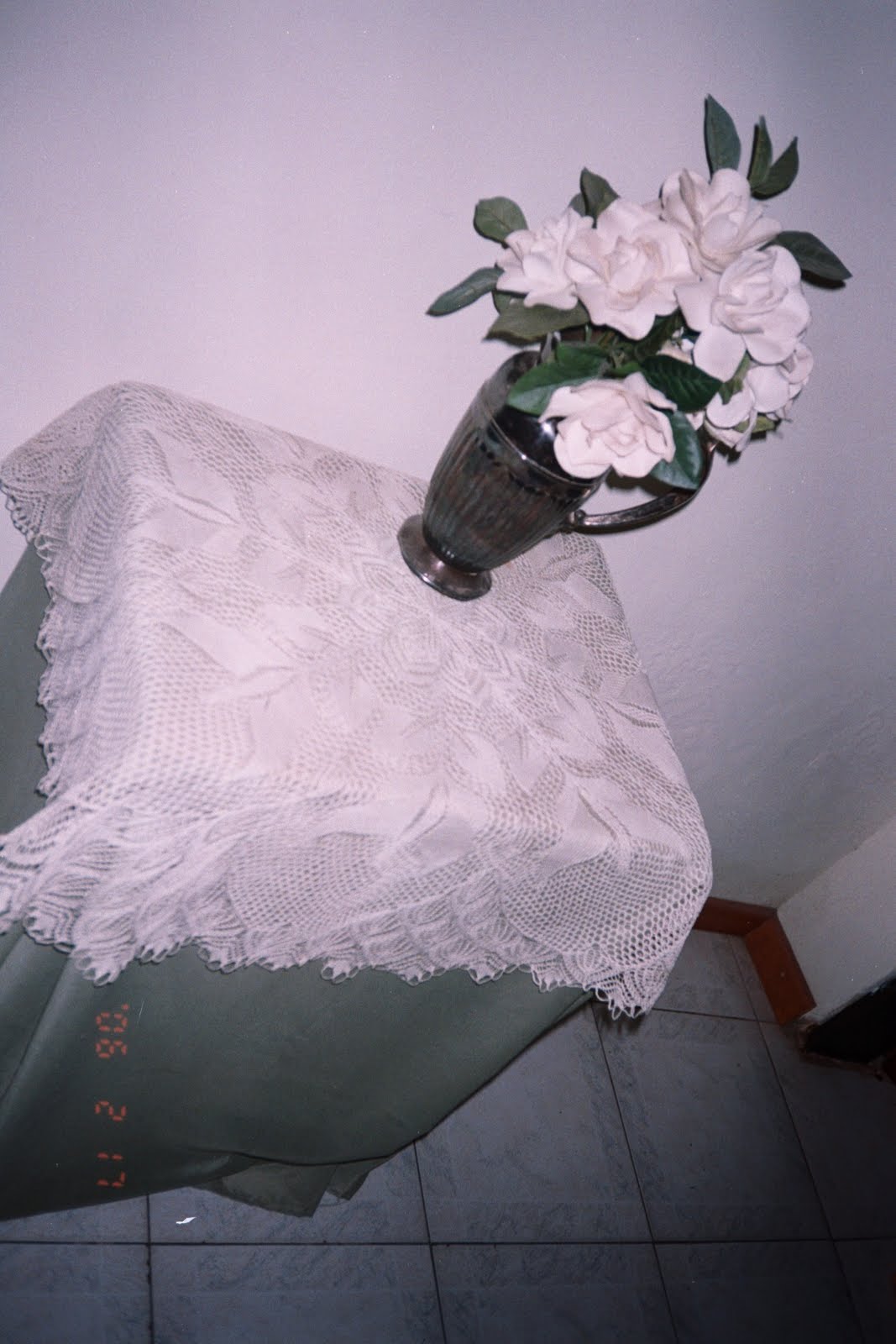 Las medidas del mantel son aproximadamente 0,85 X 0,85 cm. Esta puesto sobre otro de tela que viste toda la mesita para que resalte el contraste.