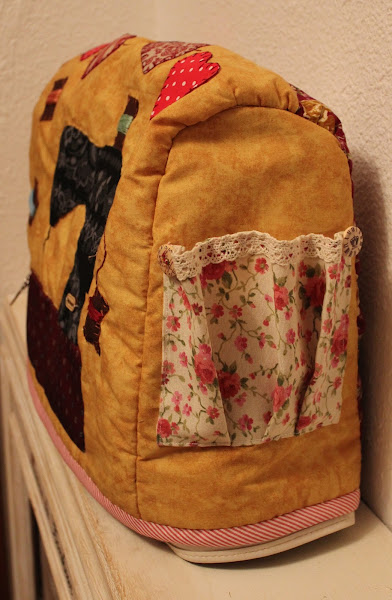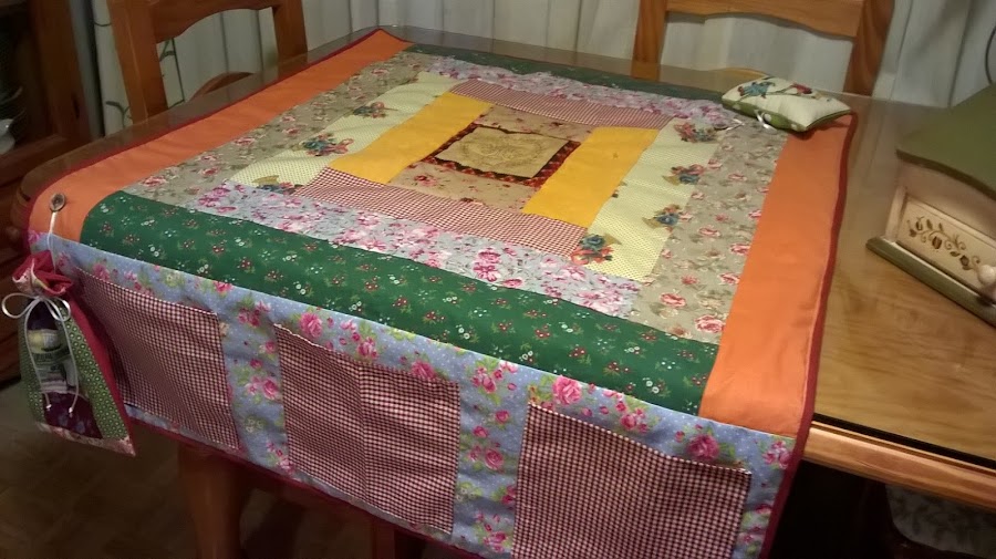 A juego con la otra funda, todo muy country, adapatamos la medida del mantel a la mesa en la que trabaja habitualmente. Al final, 0.80x 1.10 cm., formando un log cabin a partir de un motivo central y con una parte con bolsillos grandes que cuelga por delante. Además, bolsa para tijeras, cutter.... y alfileteros con su inicial de un panel precioso con motivos de cartillas escolares.