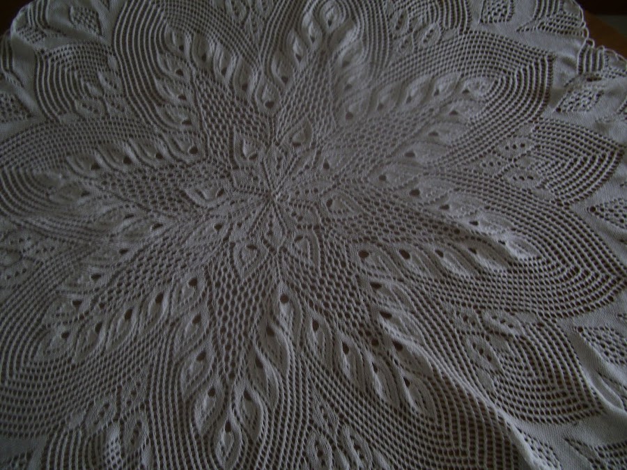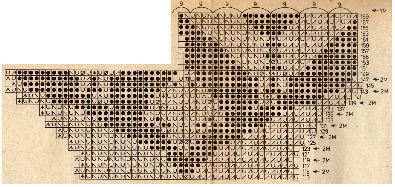 En la 26º, 46º,58º, 70º, 82º, y 94º v, tejer de las 4 lazadas 6 puntos por lazada , alternando der, y rev.