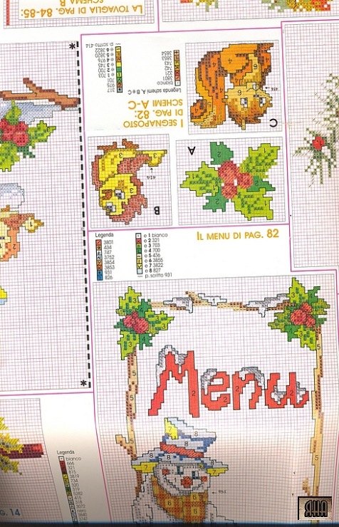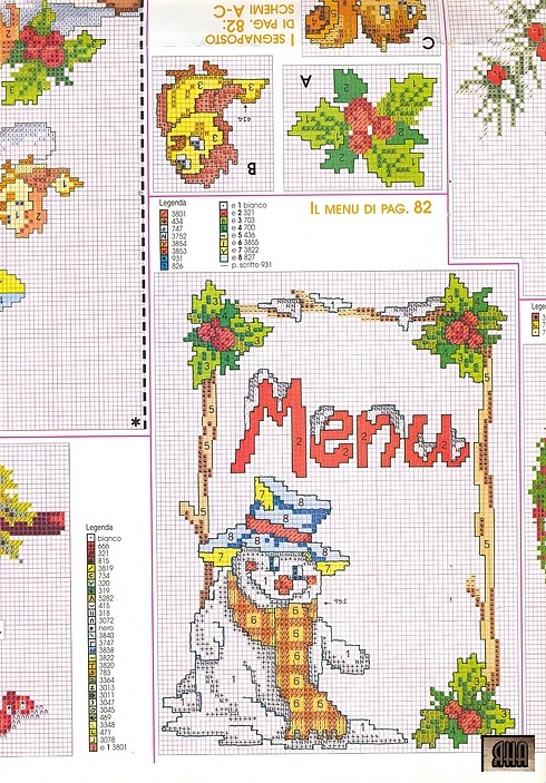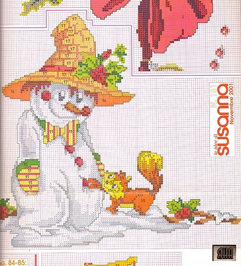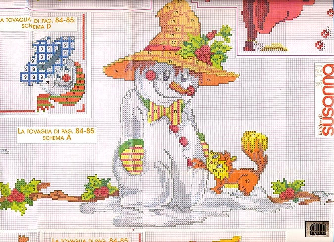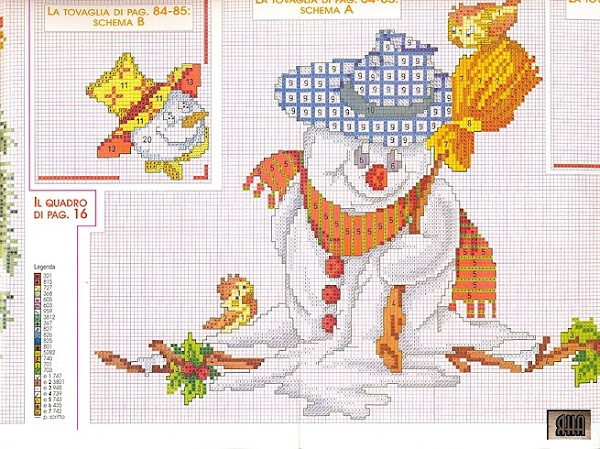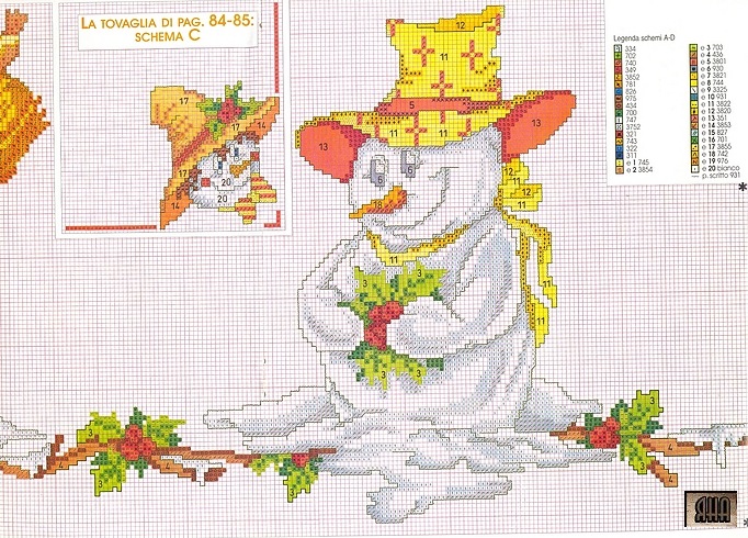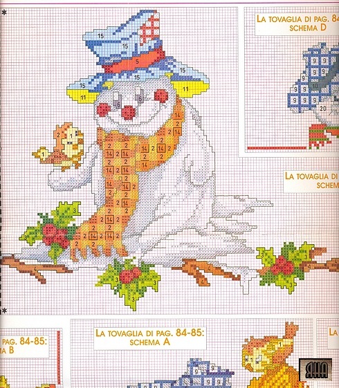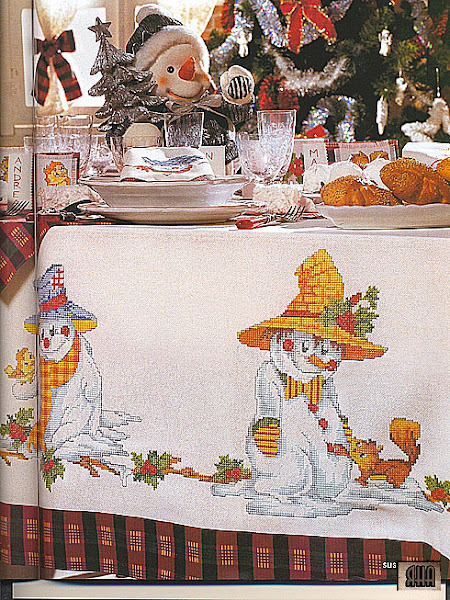 Bonito gráfico de una mantelería de muñecos de nieve en punto de cruz...