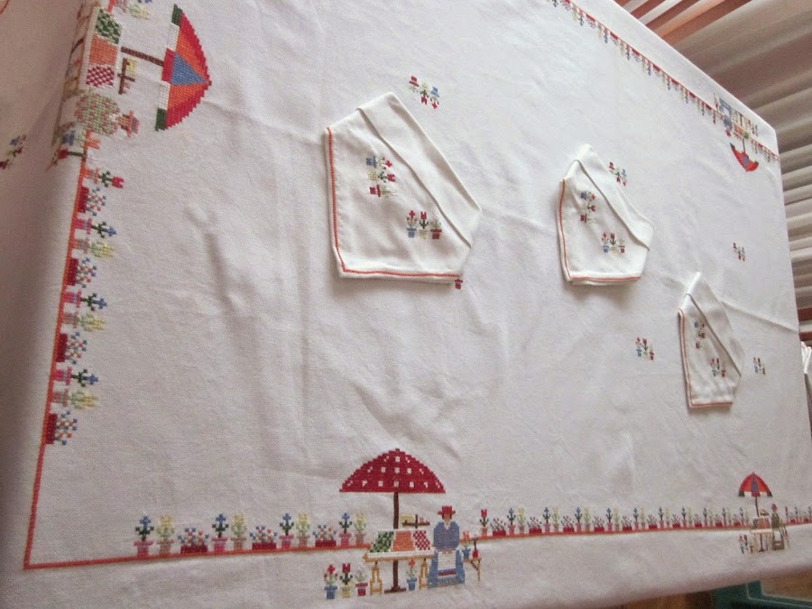 CADA VENDEDORA CON SU PUESTO DE FLORES Y TODAS UNIDAS POR UNA HILERA DE MACETAS. PARA ESTE MANTEL TAMBIÉN LE HICE LAS SERVILLETAS.