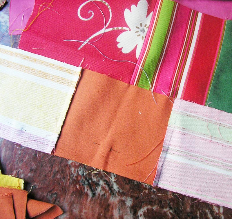 Puse este trozo de tela blanca con piquillo rojo. Primero coses el piquillo a la tela banca y luego a al parte de los trozos.