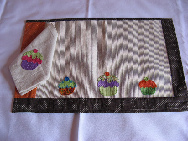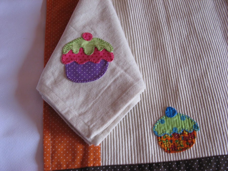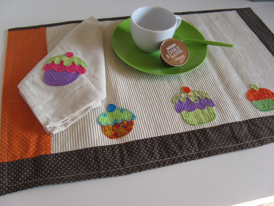 Cogi un individual que habia comprado en CASA VIVA, y le cosi unas telas alrededor para darle un poco mas de cabida; ya que era un poco justo. Unos cupcakes o pastelitos aplicados con punto festón y tenemos un regalos bonito y original.