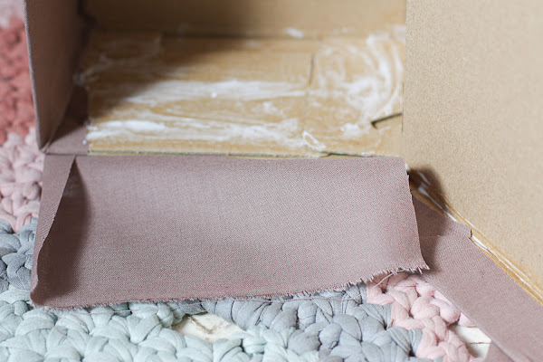 1. Forra la caja: con un trozo de tela, empieza a forrar el exterior de tu caja. Unta cada cara con un poco de cola y ve pegando la tela desde el centro hacia los laterales, asegurándote de no dejar arrugas. Ve cortando si fuera necesario, el exceso de tela para ajustarlo al máximo al tamaño de tu caja.