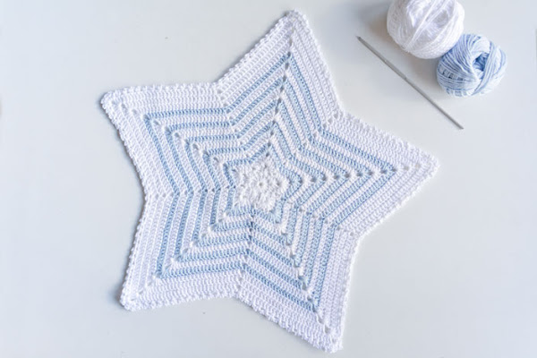 De la mantita hay muchos patrones muy parecidos para hacerla. Yo la he sacado de aquí The Crochet Crowd. En su web podéis ver el patrón, el diagrama y un vídeo de cómo se hace, aunque está en inglés.Más tarde encontré este otro vídeo en castellano de Lanas y ovillos, que creo que es un poco diferente pero el resultado es igual de bonito.