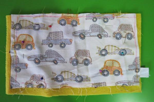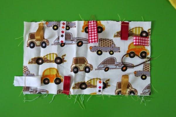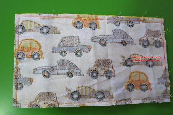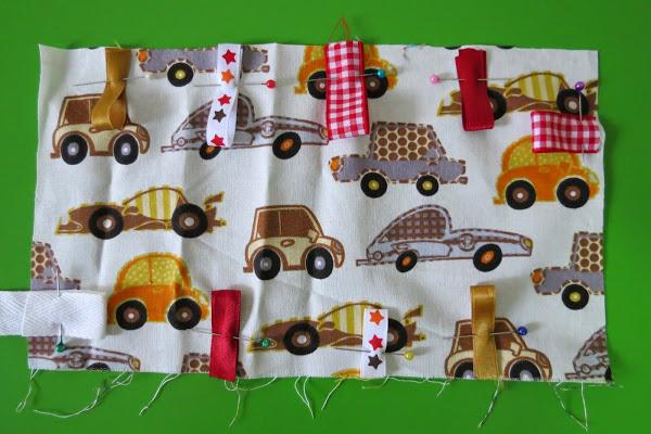Lo primero que hacemos es situar sobre el rectángulo de tela, en mi caso de coches, todas las etiquetas dobladas a la mitad y mirando hacia adentro, como os muestro en la imagen siguiente.