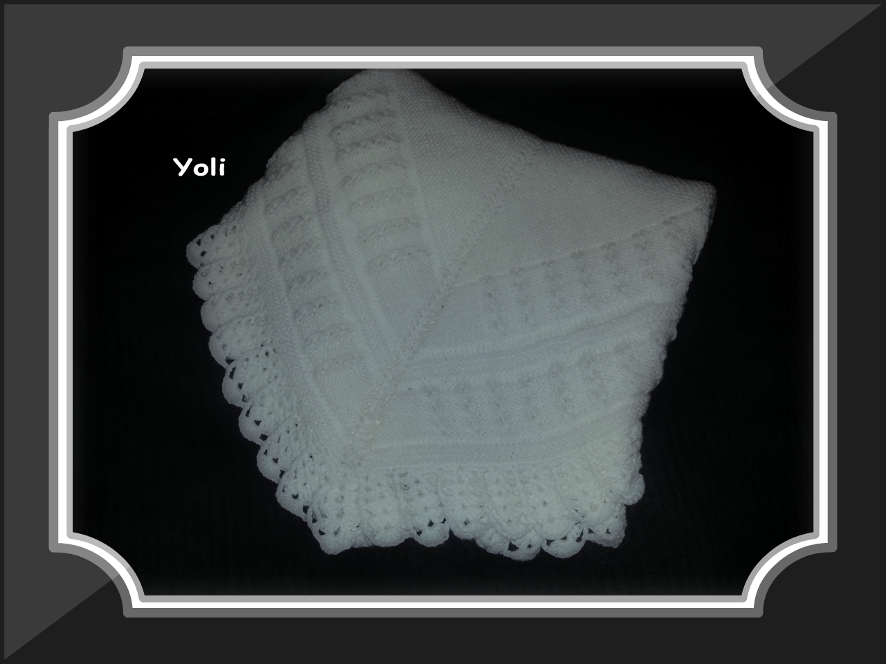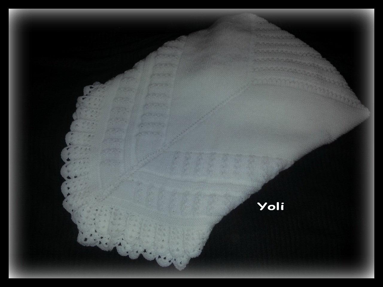 La original es una colchita para el cuco o moises, pues bueno según iba haciendo iba modificando, que si mas grande el centro, mas largura a las partes para que fuese mas manta, que si el dibujo original no venia bien explicado y cambie por punto musgo para no complicarme rectificando..., que si el volante original no me gustaba... en fin que cambie totalmente el diseño............total como iba a ser una muestra............