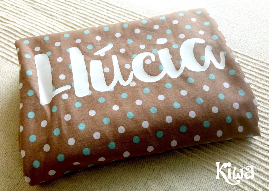 Exterior en algodón de patchwork de colores neutros y bonitos. Personalizada con el nombre en vinilo textil.