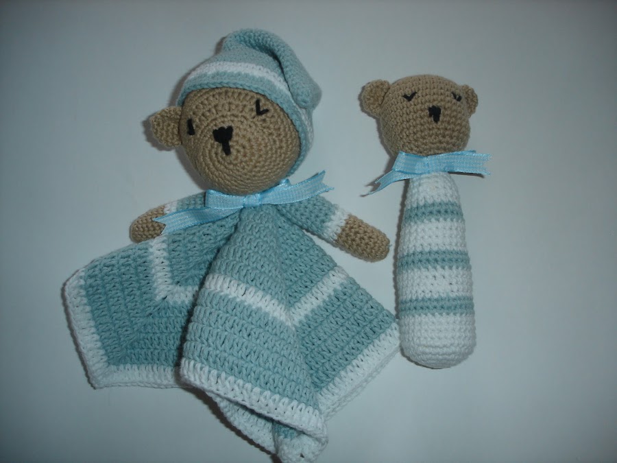 Hola de nuevo; hoy os traigo mi último encargo, que he hecho entre cosita y cosita de Navidad, que dicho sea de paso, espero terminar antes de que acabe jajaj: una mantita de apego y un sonajero para ...