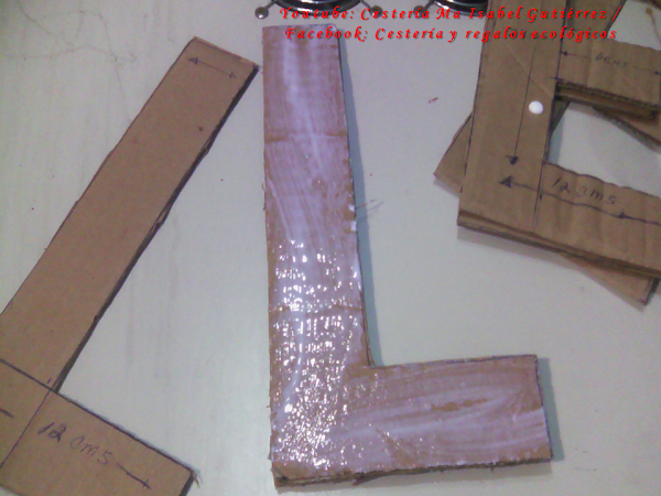 Ya que tenemos todas las letras forradas y las dos piezas del corazón pegamos entre sí, pero solo debemos pegar de la mitad del corazón hacia abajo, para que podamos meter la foto por la parte de arriba... Acomodamos todas las letras y medimos cuanto espacio ocupan así, de manera horizontal, en mi caso, en total midió 22 pulgadas (una disculpa por medir en pulgadas, no tenía una cinta métrica en cmts), así que para la base, corté tres piezas rectangulares de cartón grueso y duro que miden 23 " de largo por 6" de ancho...