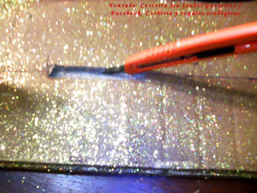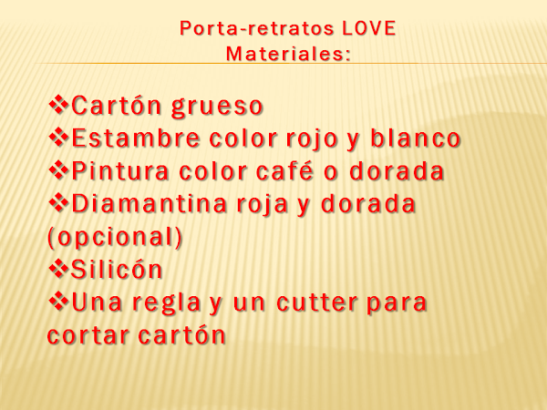 Pegamos entre sí estas tres piezas de cartón, pintamos en color dorado o en café claro y dejamos caer un poco de diamantina dorada. A las letras, también podemos pegar un poco de diamantina roja...
