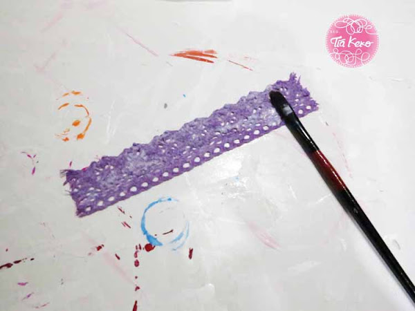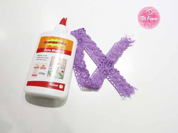 Como segundo paso vamos a darle una generosa capa de cola blanca a todo el trozo de cinta de ganchillo.