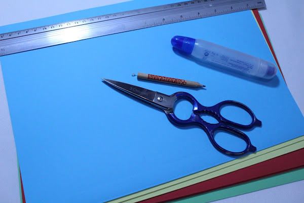 Marca lineas, en las cartulinas de colores, de 21cm por 2,5cm, y después recorta.