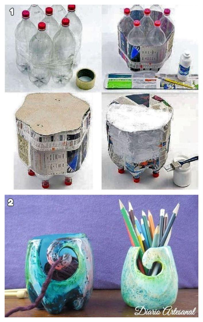 1 https://www.pinterest.es/pin/748160556833762360/?nic_v2=1a2JuCsr6 2 https://www.pinterest.es/pin/733101645569111762/?nic_v2=1a2JuCsr6 Con botellas de plástico y otros materiales sencillos también podrás elaborar banquitos, pufs y taburetes como el que encontrarás en la imagen a continuación. Asimismo, podrás elaborar una hermosa lapicera. Recuerda que más que cortar aquí y allá un envase de plástico, lo que convierte una manualidad en la mejor de todas es tu toque personal y creativo. Con toda seguridad, estas ideas te servirán para inspirarte.