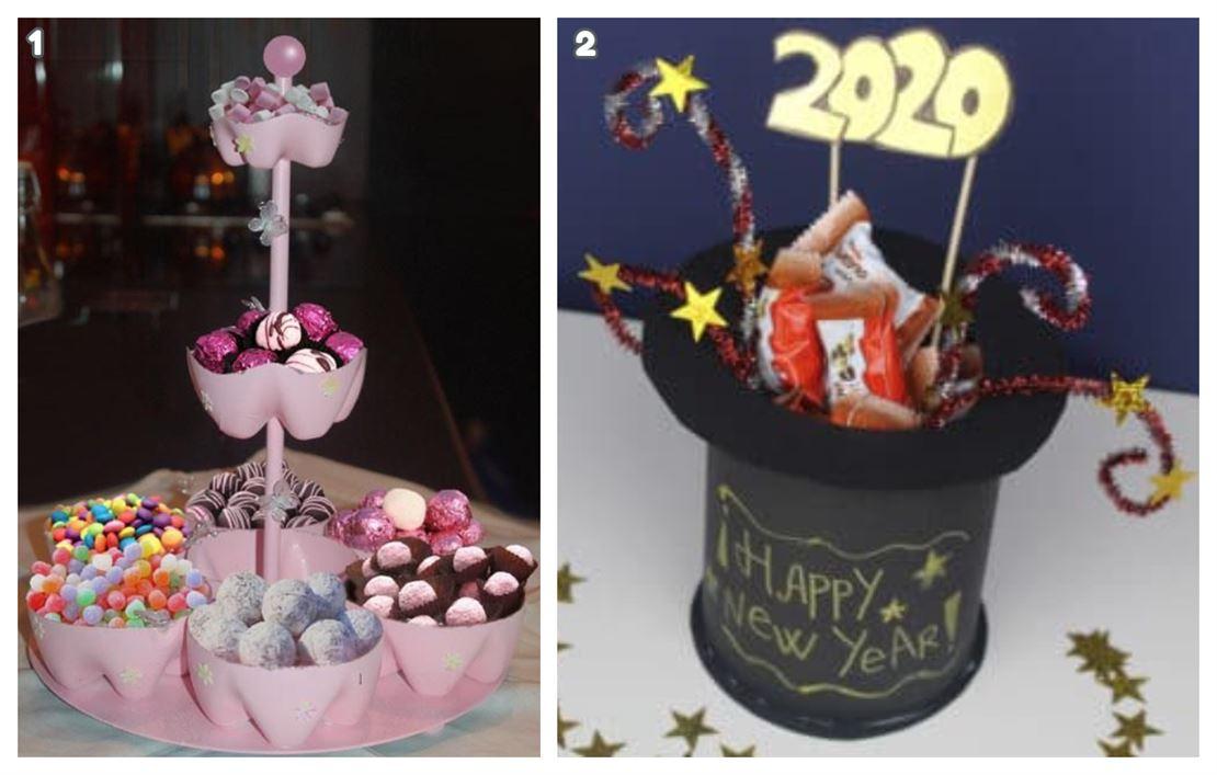 Para decorar en fiestas y eventos, nada mejor que las manualidades con botellas de plástico. Nadie pensaría que dentro de ese sombrero puede haber una botella plástica que le da resistencia al adorno. Y en el caso de la torre de dulces, las formas propias de la botella le dan un toque muy bonito al adorno.