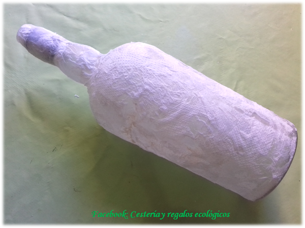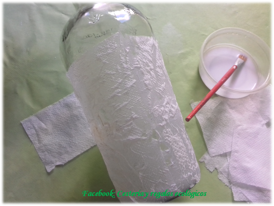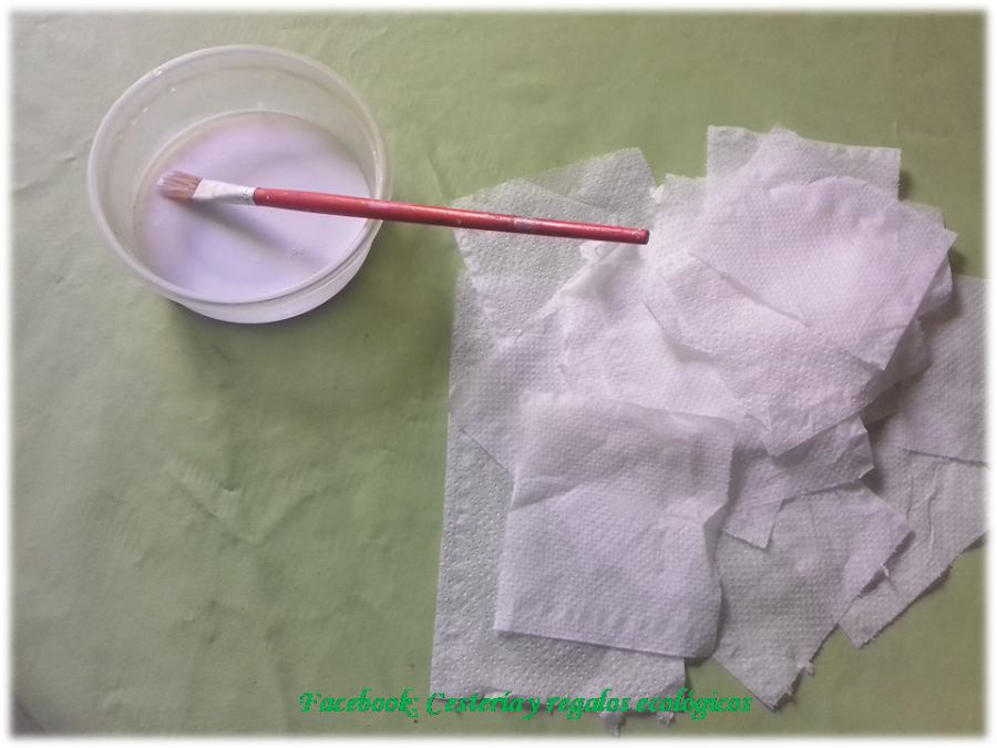 Para dar textura, vamos a forrar con dos capas de servilletas de papel o de papel higiénico, y pegamos con una mezcla aguada de pegamento o cola blanca común y agua...