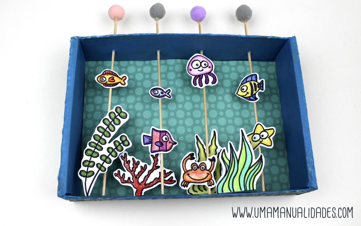 Otra idea muy interesante es el acuario de cartón, muy sencillo de realizar y con resultados muy llamativos.