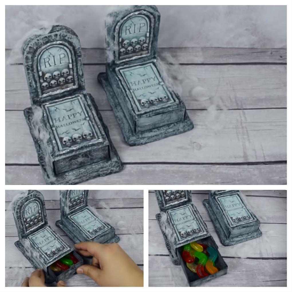 Si deseas una decoración espeluznante, fantasmagórica y horripilante puedes convertir un par de cajitas de cerillas en un par de tumbas con su respectiva lápida e inscripción y, en su interior, los dulces favoritos de tus pequeños.
