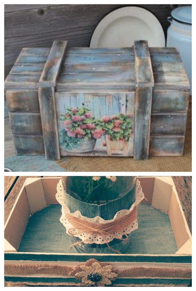A simple vista puede parecer que se trata de una cajita teñida, pero en realidad está forrada con retazos de tela de jean, que junto al encaje, los detalles de yute y el color natural de la madera de la cajita convierten este adorno en un objeto digno de admirar. ¡Será el centro de mesa que todos querrán llevarse a casa!Con estas imágenes no quedará ni pizca de duda de que un poco de pincel seco por aquí, una pasadita de lija por allá, un buen diseño estampado para hacer decoupage y un par de cestitas harán de una simple cajita de frutas un hermoso y útil objeto para decorar el hogar.